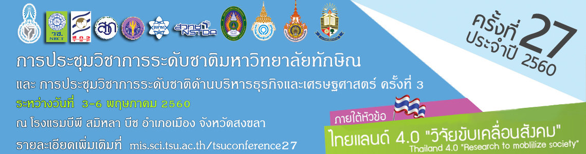 สถาบันวิจัยและพัฒนา และคณะเศรษฐศาสตร์และบริหารธุรกิจ มหาวิทยาลัยทักษิณ กำหนดจัดงานประชุมวิชาการระดับชาติมหาวิทยาลัยทักษิณ ครั้งที่ 27 ประจำปี 2560 และการประชุมวิชาการระดับชาติด้านบริหารธุรกิจและเศรษฐศาสตร์ ครั้งที่ 3 ภายใต้หัวข้อ ประเทศไทย 4.0 "วิจัยขับเคลื่อนสังคม" : Thailand 4.0 "Research to Moblilize Society" ในระหว่างวันที่ 3-6 พฤษภาคม 2560 ณ โรงแรมบีพี สมิหลา บีซ อ.เมือง ข.สงขลา