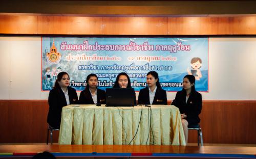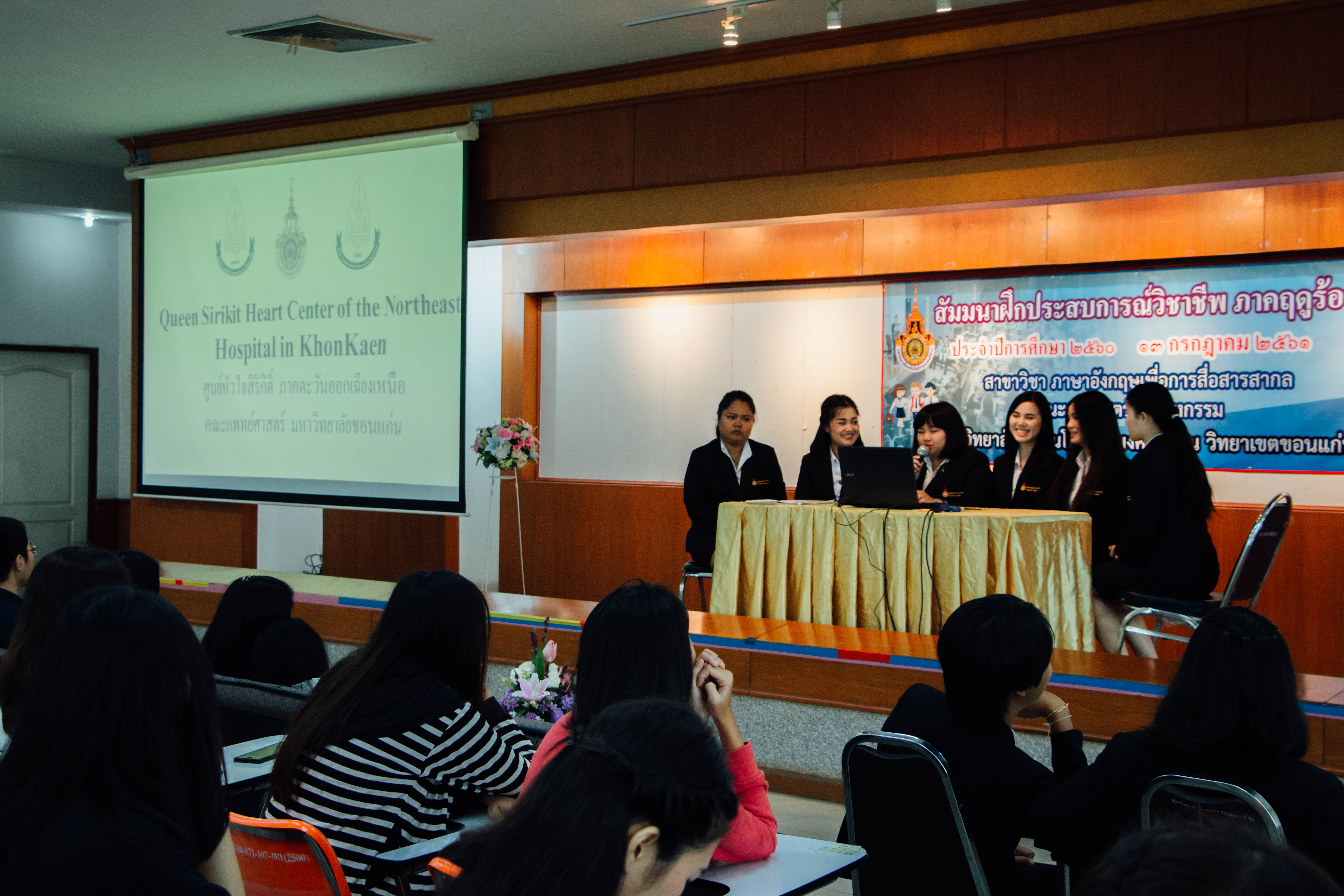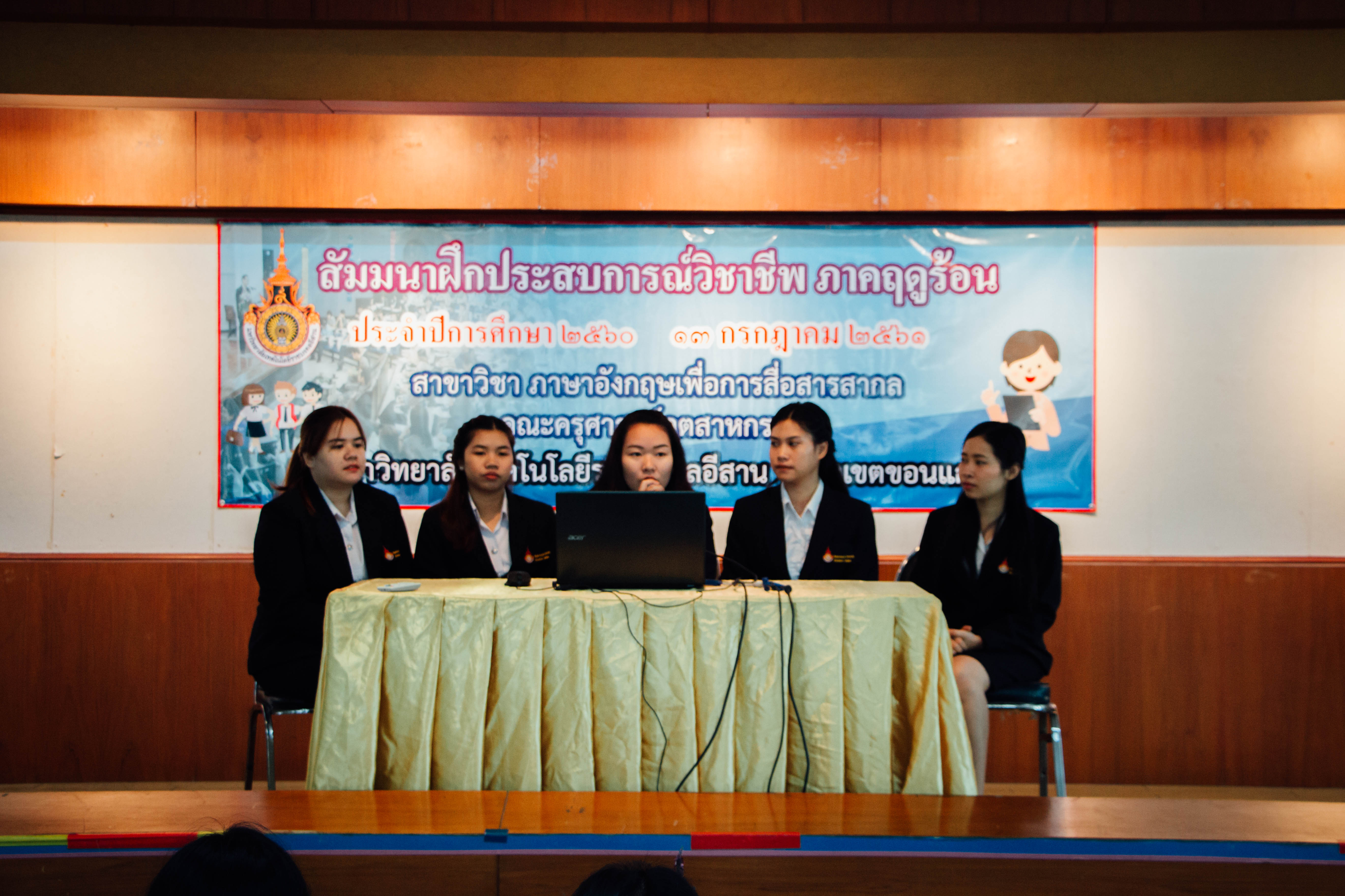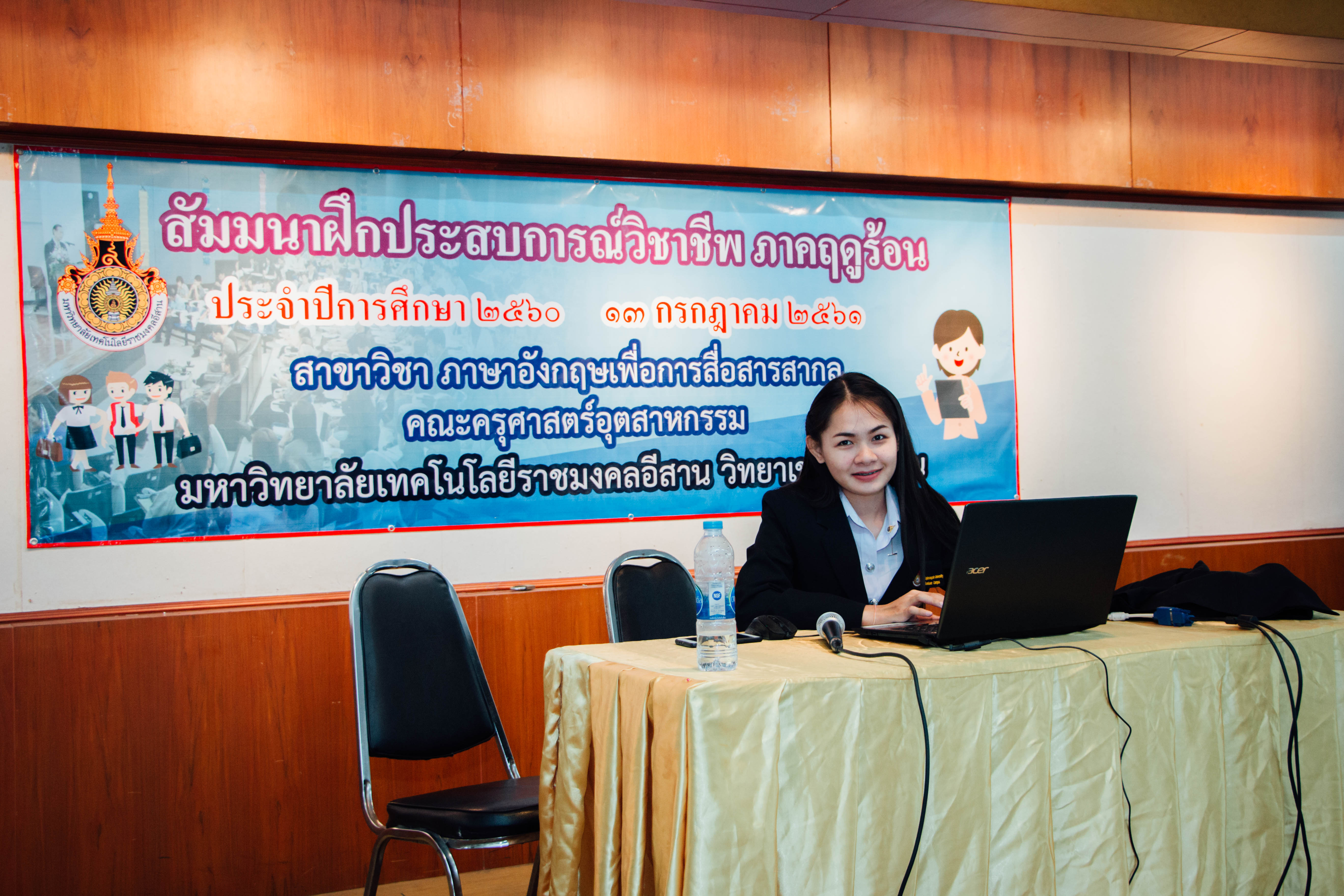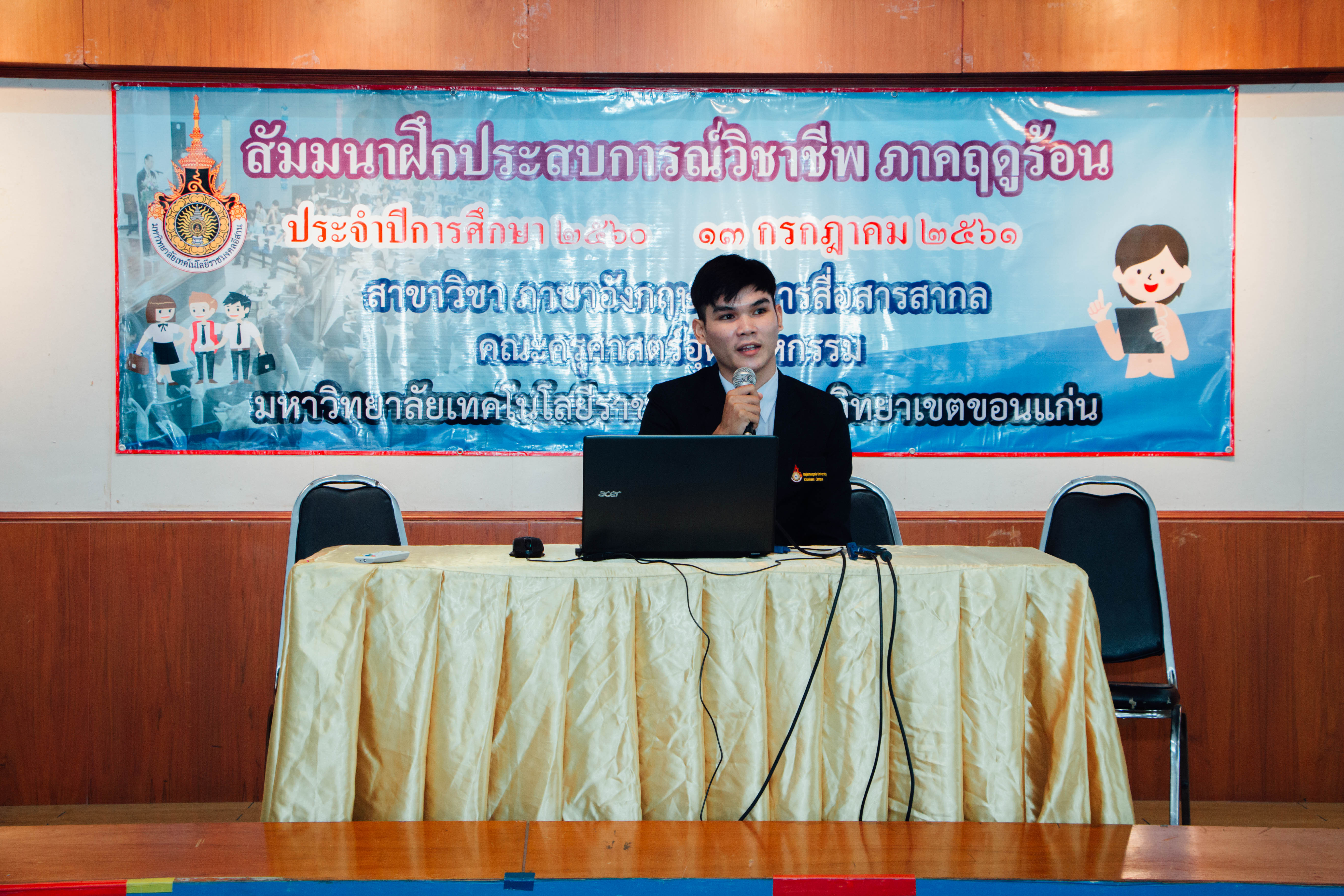วันที่ 13 กรกฎาคม 2561 สาขาวิชาภาษาอังกฤษเพื่อการสื่อสารสากล คณะครุศาสตร์อุตสาหกรรม มหาวิทยาลัยเทคโนโลยีราชมงคลอีสาน วิทยาเขตขอนแก่น จัดสัมมนาฝึกประสบการณ์วิชาชีพ ภาคฤดูร้อน ณ ห้อง 14505 อาคาร 14 เพื่อแลกเปลี่ยนความรู้ ทักษะ และประสบการณ์ระหว่างผู้ฝึกงานและรุ่นน้องในสาขาวิชาฯ โดยมีอาจารย์และนักศึกษาชั้นปีที่ 1 ประจำสาขาวิชาฯ เข้าร่วมรับฟังตลอดการสัมมนา เพื่อให้ข้อสังเกต ข้อเสนอแนะ แนวทางการปรับตัวในสถานประกอบการให้ถูกต้อง เหมาะสม และประเมินให้คะแนนการนำเสนอสัมมนาทั้งภาคบรรยายและจัดบอร์ดนำเสนอ