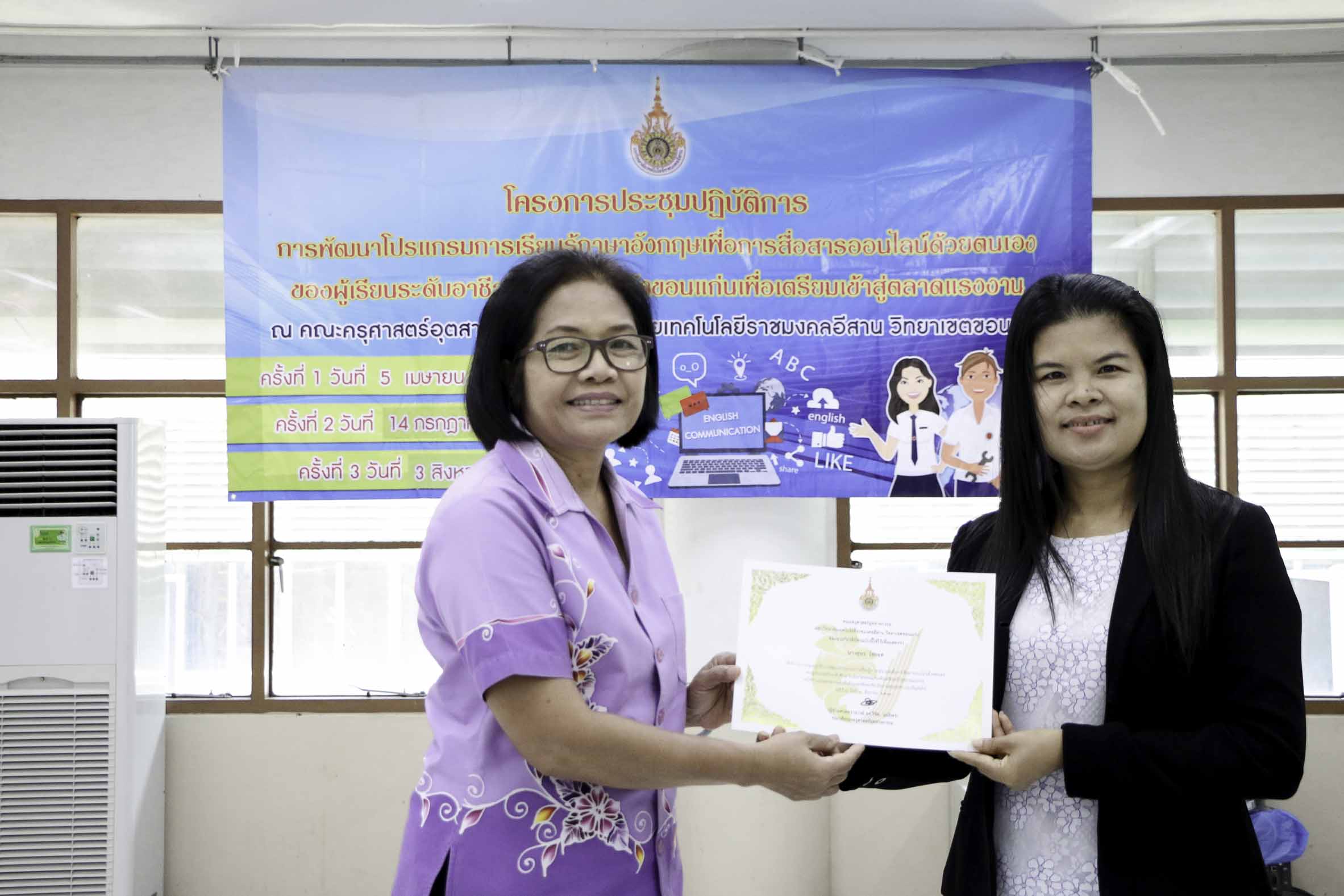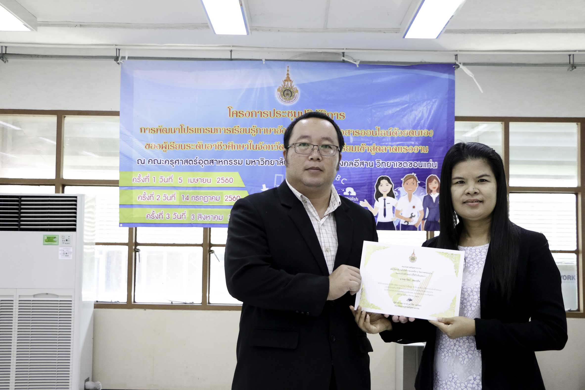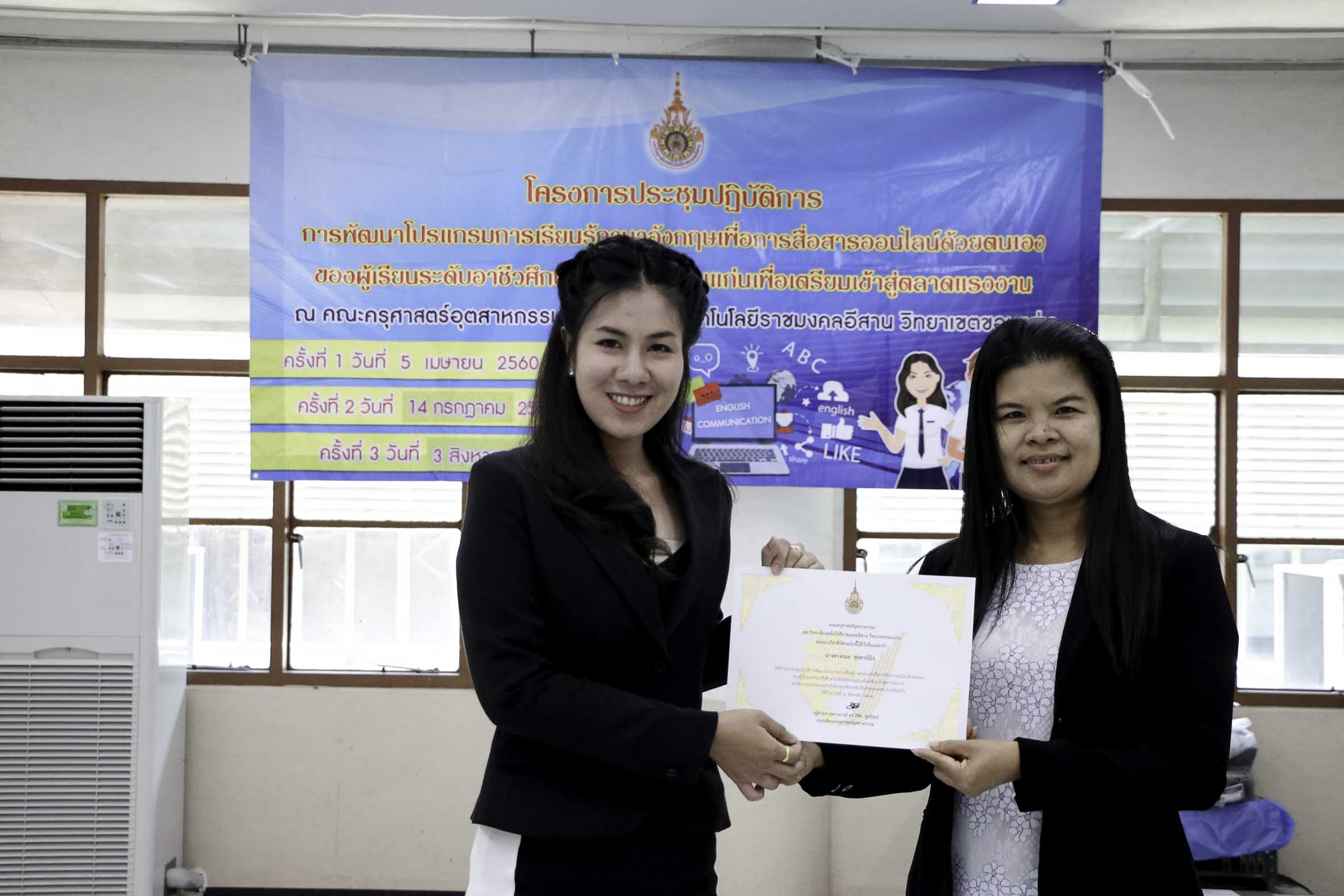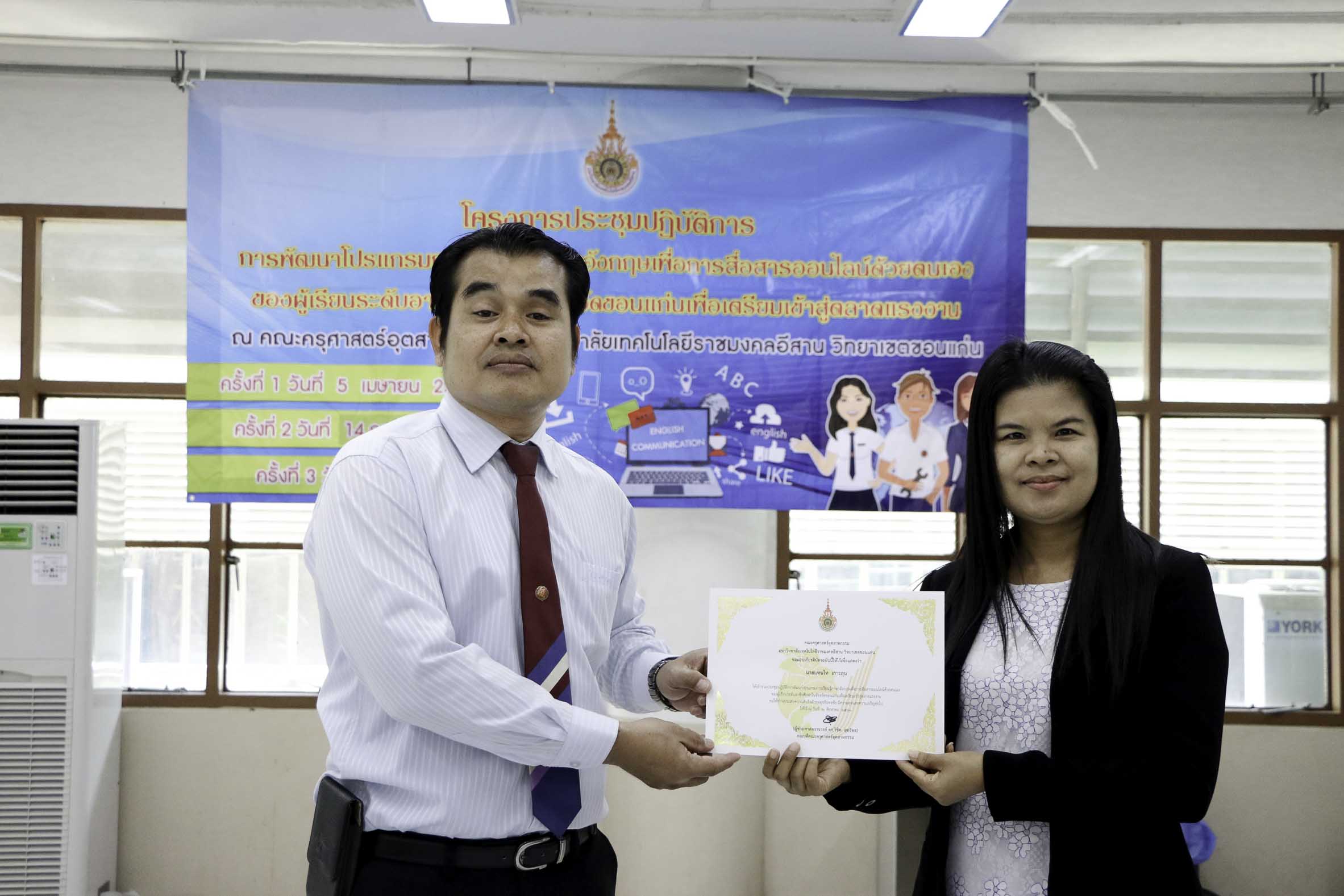 วันที่ 3 สิงหาคม 2561 สาขาวิชาภาษาอังกฤษเพื่อการสื่อสารสากล คณะครุศาสตร์อุตสาหกรรม มหาวิทยาลัยเทคโนโลยีราชมงคลอีสาน วิทยาเขตขอนแก่น จัดโครงการประชุมปฏิบัติการพัฒนาโปรแกรมการเรียนรู้ภาษาอังกฤษเพื่อการสื่อสารออนไลน์ด้วยตนเองของผู้เรียนระดับอาชีวศึกษาในจังหวัดขอนแก่นเพื่อเตรียมเข้าสู่ตลาดแรงงาน ครั้งที่ 3 ณ อาคารวิทยบริการฯ ซึ่งมีวัตถุประสงค์เพื่อพัฒนาโปรแกรมการเรียนรู้ภาษาอังกฤษเพื่อการสื่อสารออนไลน์ด้วยตนเองของผู้เรียนระดับอาชีวศึกษาในจังหวัดขอนแก่นเพื่อเตรียมพร้อมสู่ตลาดแรงงาน อีกทั้งสร้างเครือข่ายอาจารย์สอนภาษาอังกฤษในระดับอาชีวศึกษาในจังหวัดขอนแก่นให้มีคุณภาพการสอน โดยได้รับเกียรติจากดร.บูรณา เขาแก้ว หัวหน้าสาขาวิชาภาษาอังกฤษเพื่อการสื่อสารสากลเป็นผู้มอบเกียรติบัตรแก่ผู้เข้าร่วมโครงการฯ
