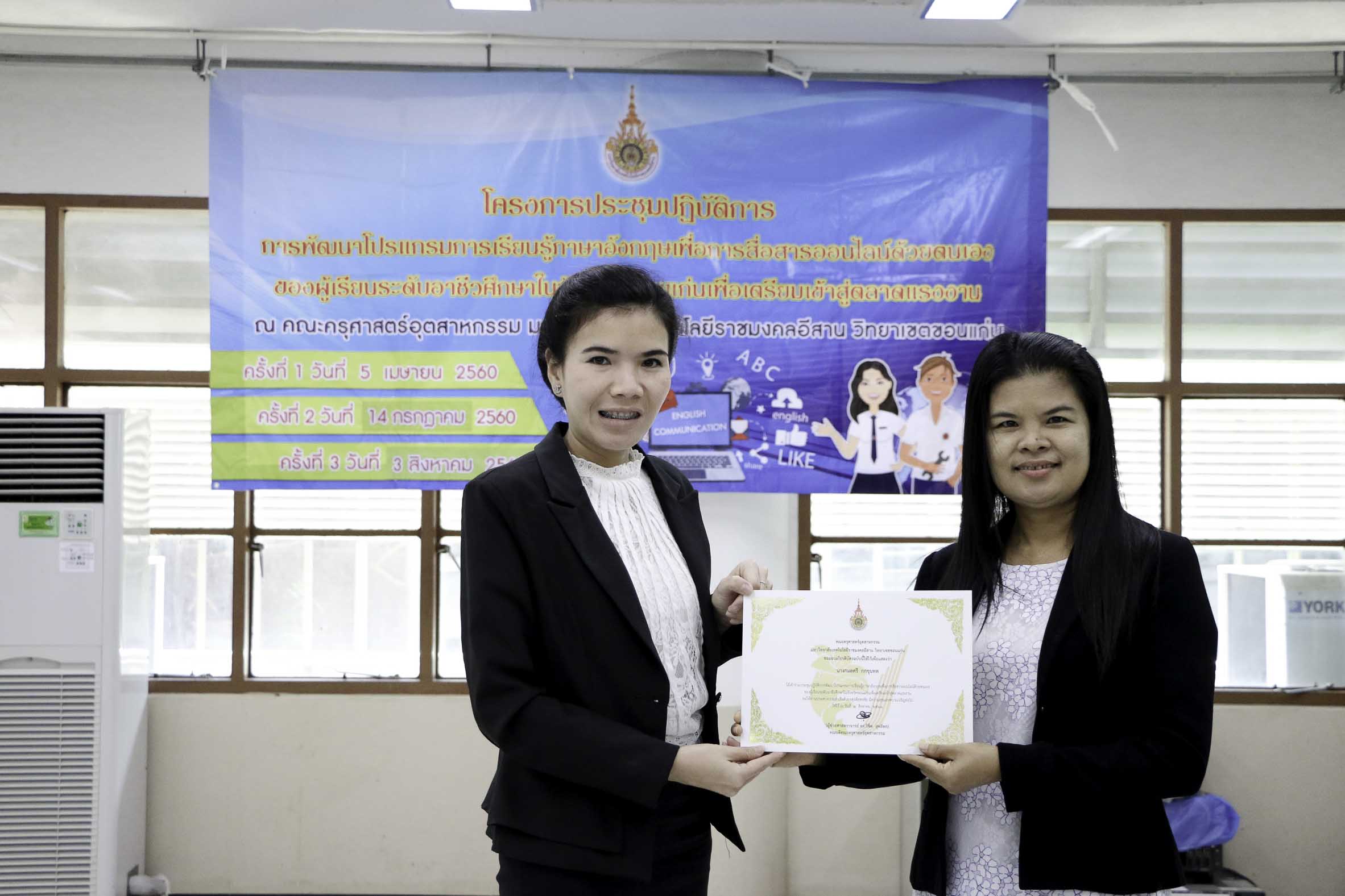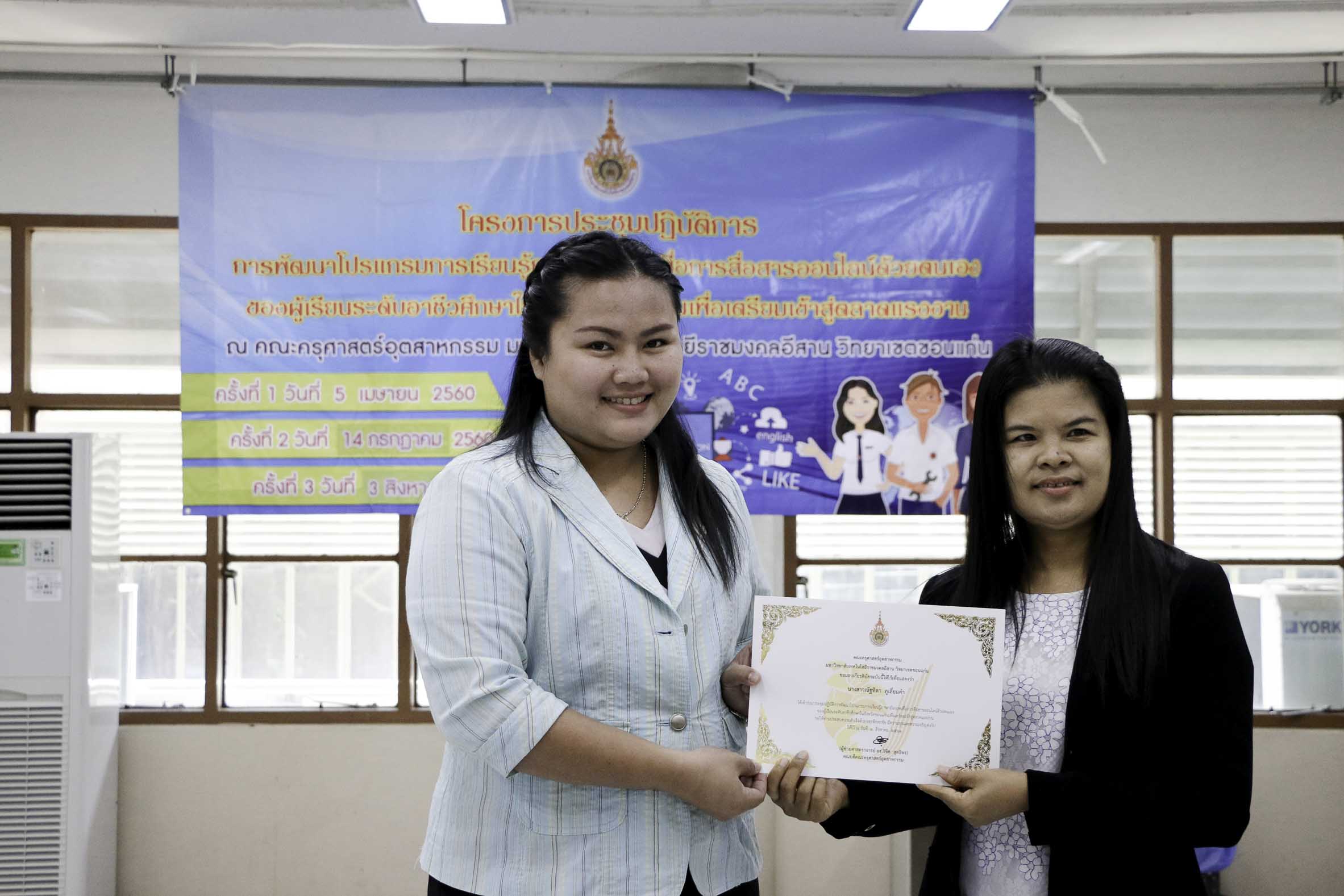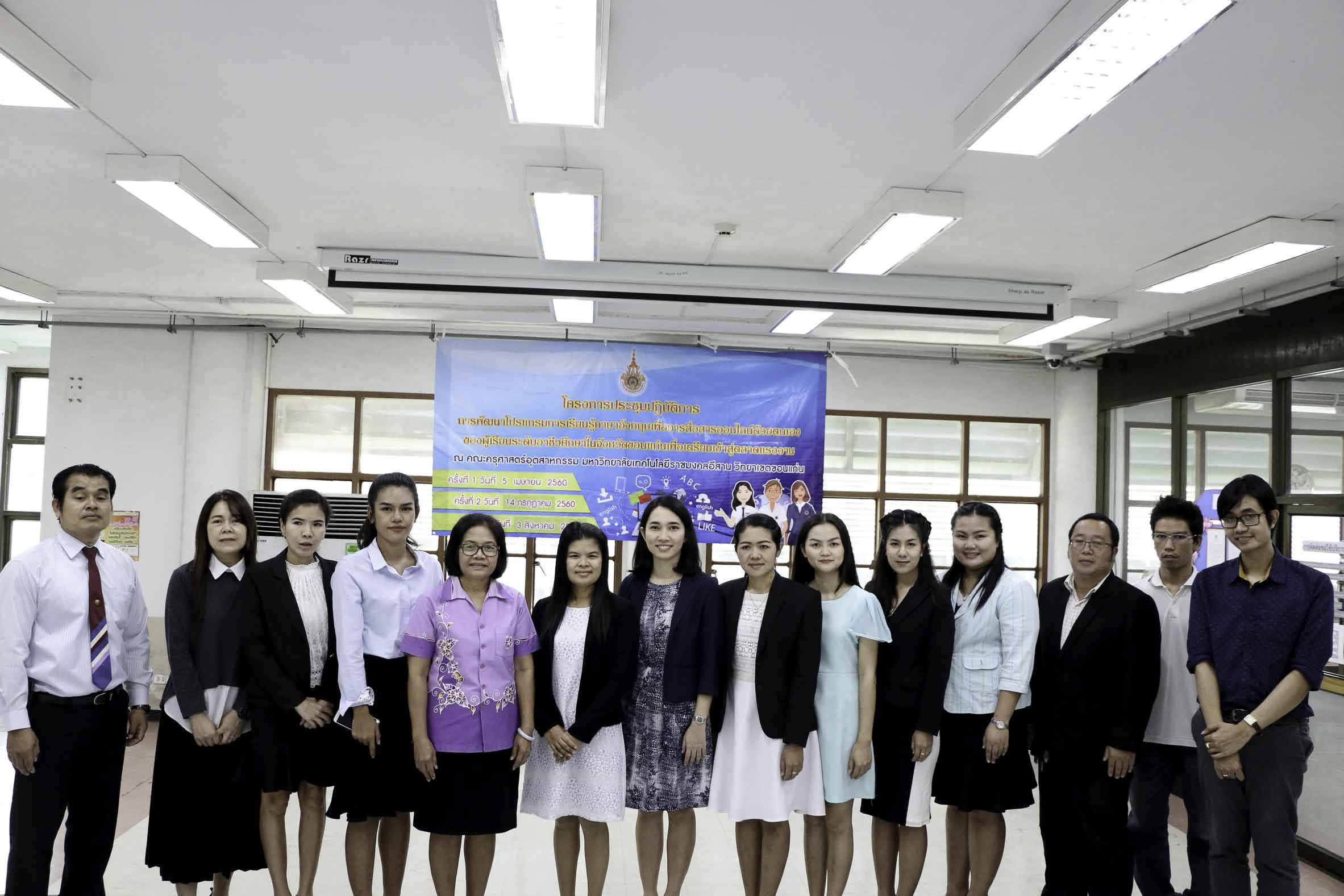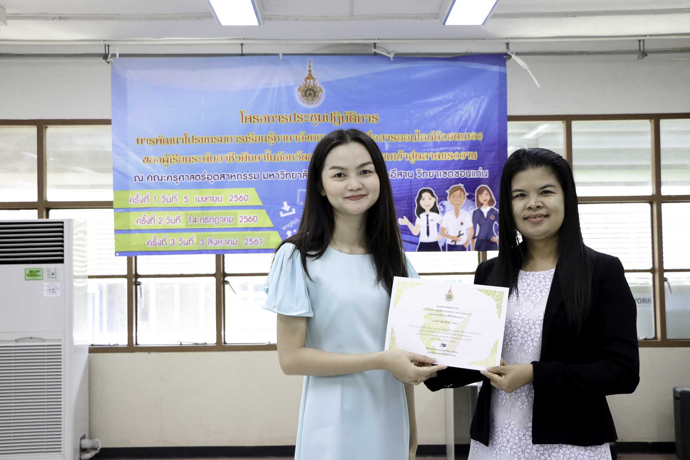 วันที่ 3 สิงหาคม 2561 สาขาวิชาภาษาอังกฤษเพื่อการสื่อสารสากล คณะครุศาสตร์อุตสาหกรรม มหาวิทยาลัยเทคโนโลยีราชมงคลอีสาน วิทยาเขตขอนแก่น จัดโครงการประชุมปฏิบัติการพัฒนาโปรแกรมการเรียนรู้ภาษาอังกฤษเพื่อการสื่อสารออนไลน์ด้วยตนเองของผู้เรียนระดับอาชีวศึกษาในจังหวัดขอนแก่นเพื่อเตรียมเข้าสู่ตลาดแรงงาน ครั้งที่ 3 ณ อาคารวิทยบริการฯ ซึ่งมีวัตถุประสงค์เพื่อพัฒนาโปรแกรมการเรียนรู้ภาษาอังกฤษเพื่อการสื่อสารออนไลน์ด้วยตนเองของผู้เรียนระดับอาชีวศึกษาในจังหวัดขอนแก่นเพื่อเตรียมพร้อมสู่ตลาดแรงงาน อีกทั้งสร้างเครือข่ายอาจารย์สอนภาษาอังกฤษในระดับอาชีวศึกษาในจังหวัดขอนแก่นให้มีคุณภาพการสอน โดยได้รับเกียรติจากดร.บูรณา เขาแก้ว หัวหน้าสาขาวิชาภาษาอังกฤษเพื่อการสื่อสารสากลเป็นผู้มอบเกียรติบัตรแก่ผู้เข้าร่วมโครงการฯ