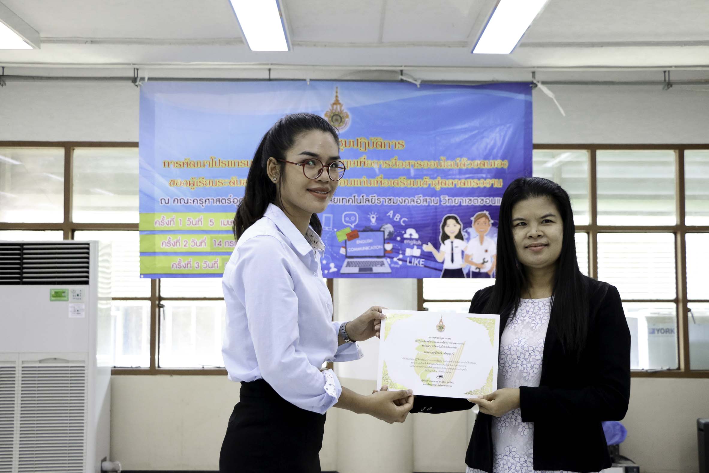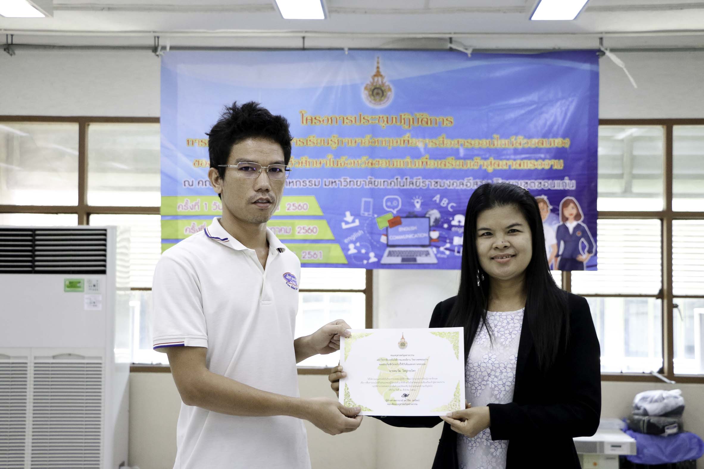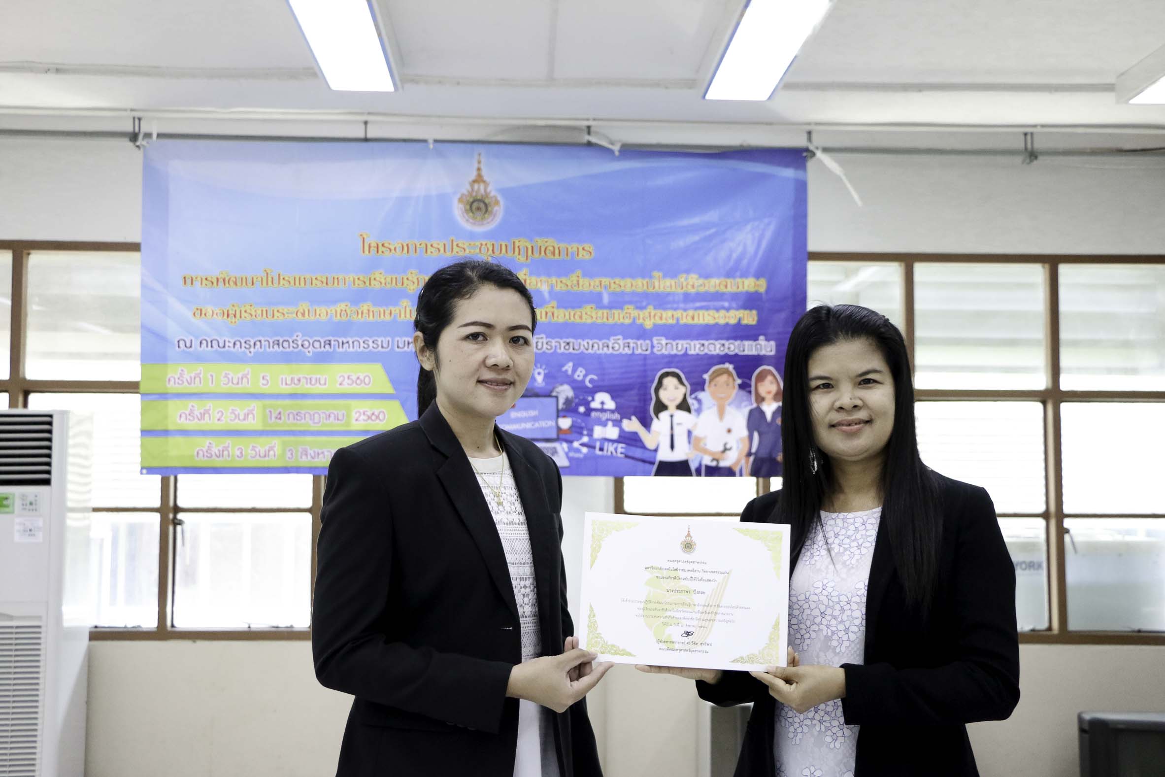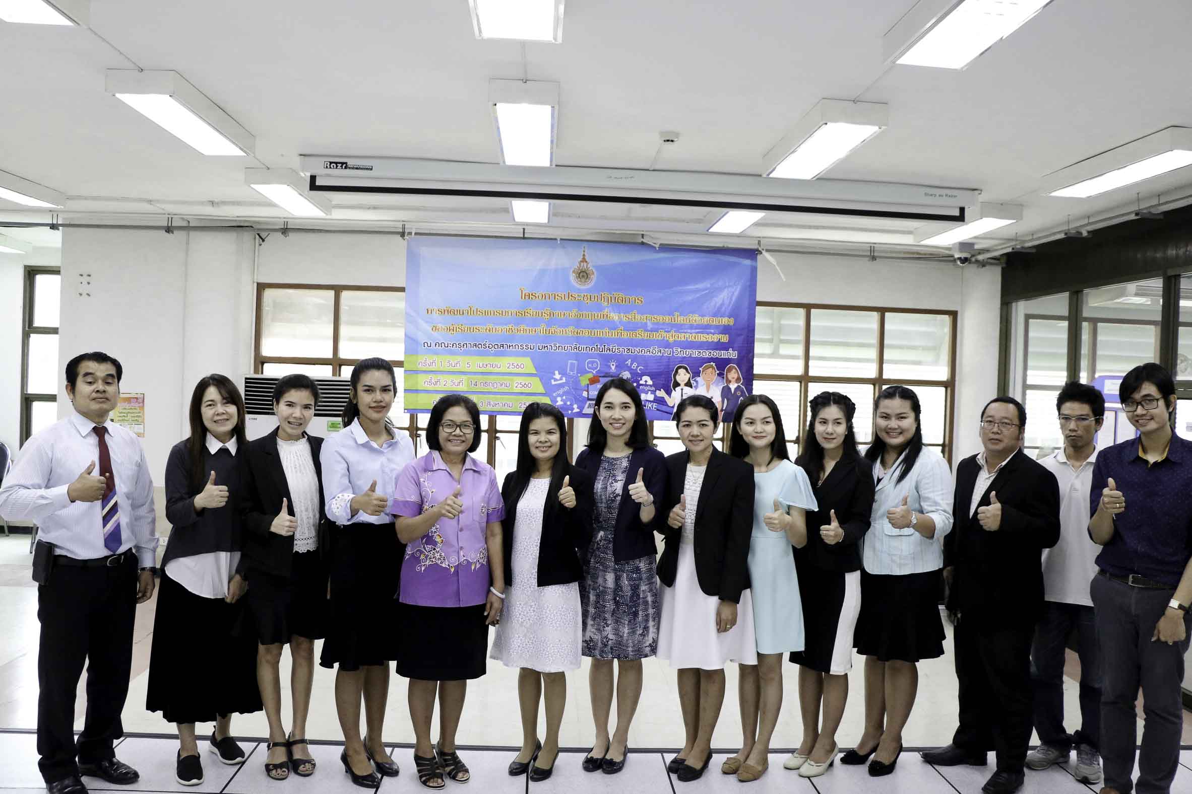 วันที่ 3 สิงหาคม 2561 สาขาวิชาภาษาอังกฤษเพื่อการสื่อสารสากล คณะครุศาสตร์อุตสาหกรรม มหาวิทยาลัยเทคโนโลยีราชมงคลอีสาน วิทยาเขตขอนแก่น จัดโครงการประชุมปฏิบัติการพัฒนาโปรแกรมการเรียนรู้ภาษาอังกฤษเพื่อการสื่อสารออนไลน์ด้วยตนเองของผู้เรียนระดับอาชีวศึกษาในจังหวัดขอนแก่นเพื่อเตรียมเข้าสู่ตลาดแรงงาน ครั้งที่ 3 ณ อาคารวิทยบริการฯ ซึ่งมีวัตถุประสงค์เพื่อพัฒนาโปรแกรมการเรียนรู้ภาษาอังกฤษเพื่อการสื่อสารออนไลน์ด้วยตนเองของผู้เรียนระดับอาชีวศึกษาในจังหวัดขอนแก่นเพื่อเตรียมพร้อมสู่ตลาดแรงงาน อีกทั้งสร้างเครือข่ายอาจารย์สอนภาษาอังกฤษในระดับอาชีวศึกษาในจังหวัดขอนแก่นให้มีคุณภาพการสอน โดยได้รับเกียรติจากดร.บูรณา เขาแก้ว หัวหน้าสาขาวิชาภาษาอังกฤษเพื่อการสื่อสารสากลเป็นผู้มอบเกียรติบัตรแก่ผู้เข้าร่วมโครงการฯ