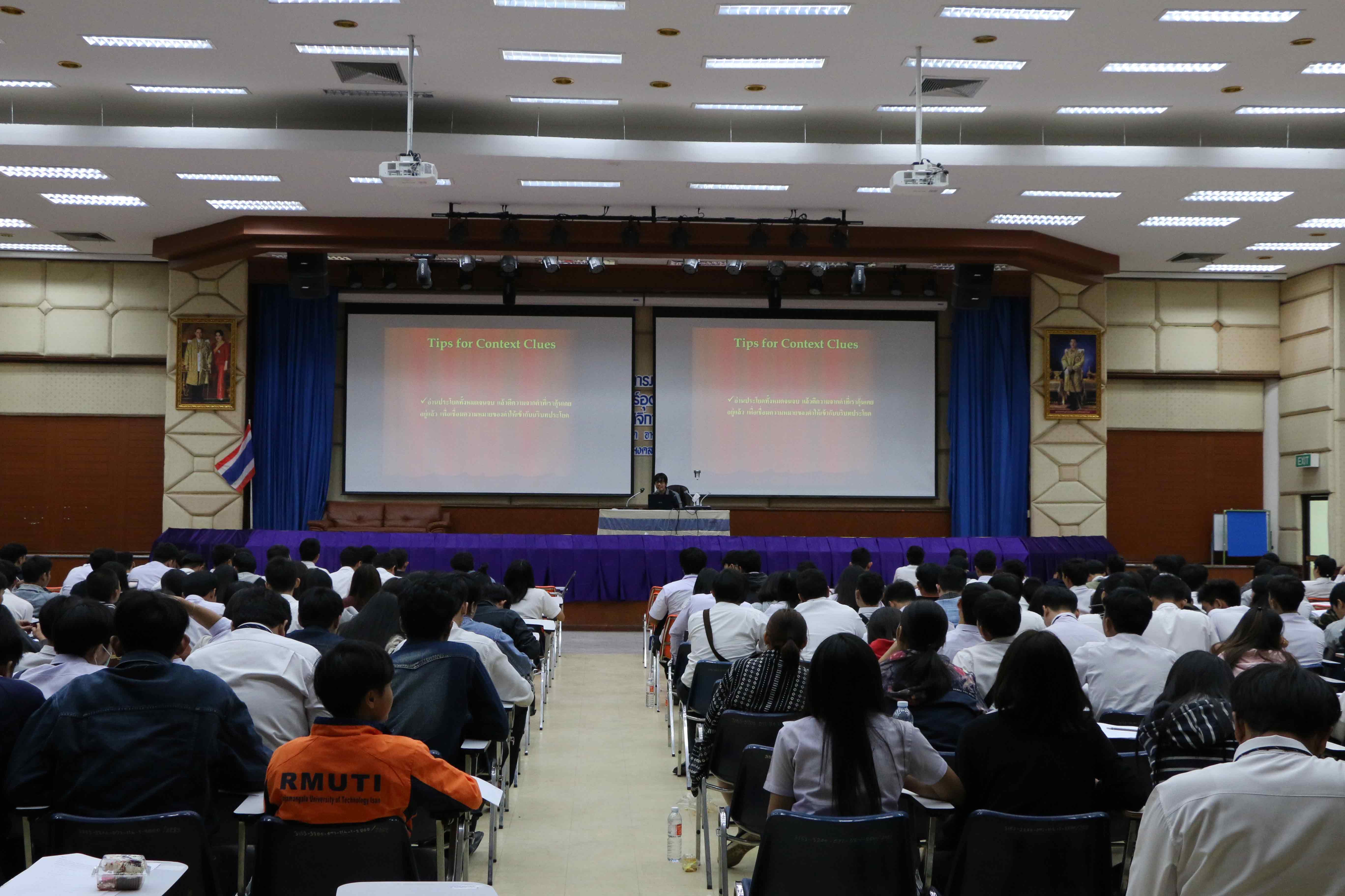 วันที่ 15 พฤศจิกายน 2561 คณะครุศาสตร์อุตสาหกรรม มหาวิทยาลัยเทคโนโลยีราชมงคลอีสาน วิทยาเขตขอนแก่น จัดโครงการอบรมอบรมภาษาอังกฤษสำหรับนักศึกษา คณะครุศาสตร์อุตสาหกรรม ณ ห้องประชุมแคแสด อาคารวิทยบริการและเทคโนโลยีสารสนเทศ โดยมีผู้ช่วยศาสตราจารย์ ดร.ณภัครอร ศรีตระการ, อาจารย์พัฐนนท์ พลหาญ อาจารย์ประจำสาขาวิชาภาษาอังกฤษเพื่อการสื่อสารสากล เป็นวิทยากรให้ความรู้ เพื่อให้นักศึกษาได้เตรียมความพร้อมสำหรับใช้ในการสอบวัดความรู้ภาษาอังกฤษ (English Exit Examination)