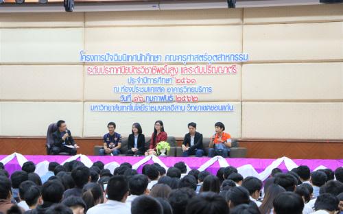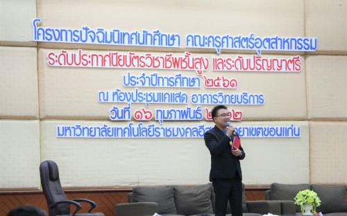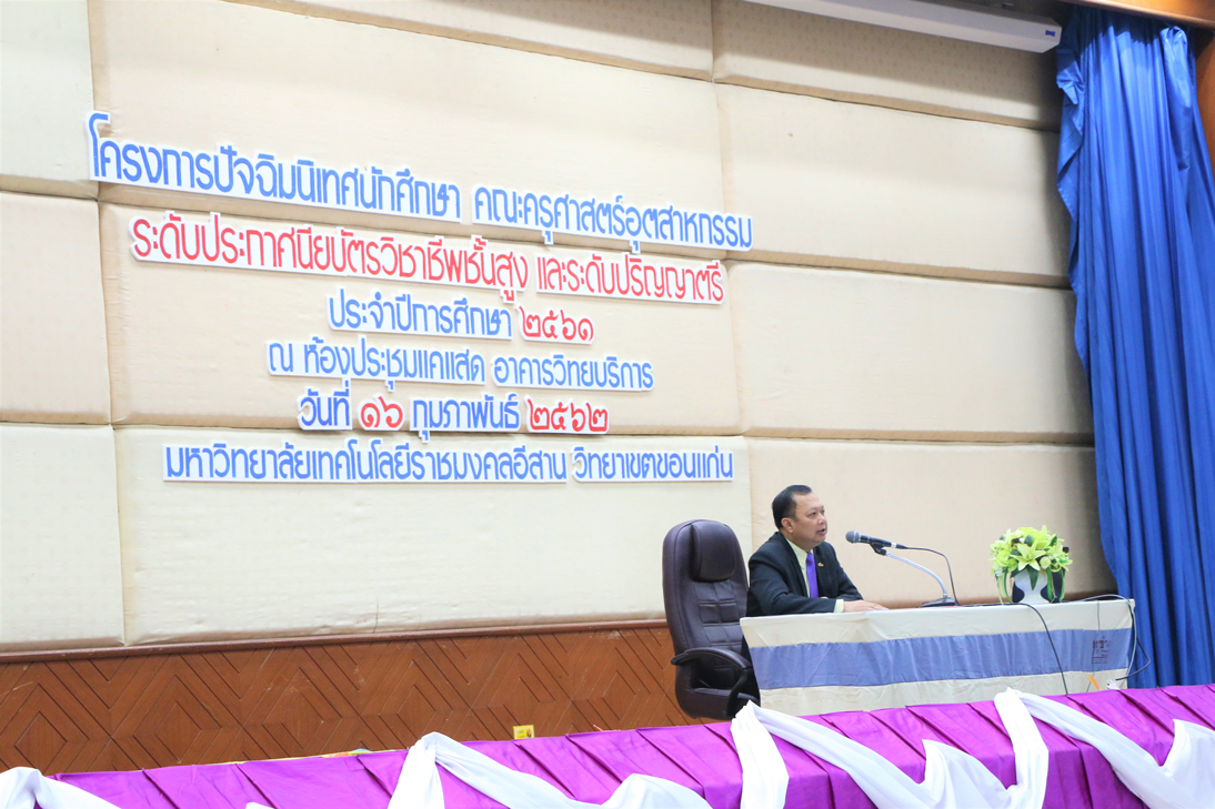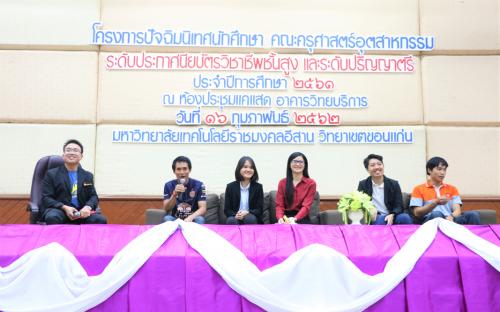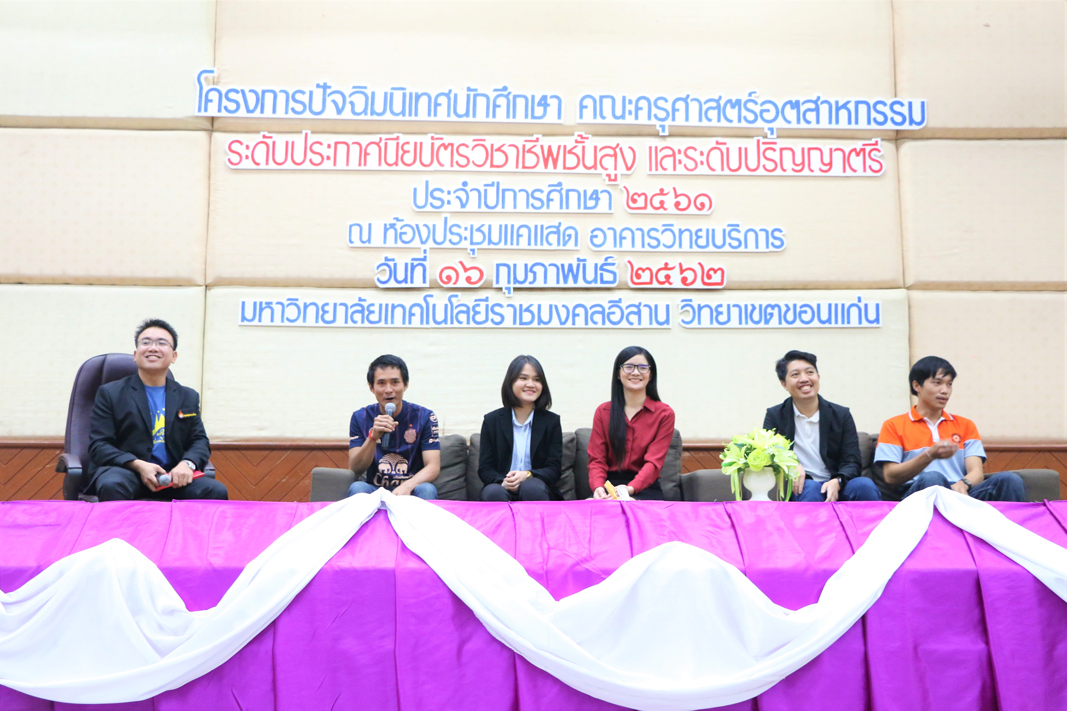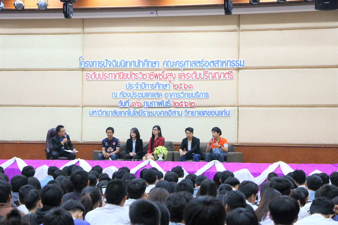 วันที่ 16 กุมภาพันธ์ 2562 ณ ห้องประชุมแคแสด อาคารวิทยบริการฯ คณะครุศาสตร์อุตสาหกรรม มหาวิทยาลัยเทคโนโลยีราชมงคลอีสาน วิทยาเขตขอนแก่น จัดโครงการปัจฉิมนิเทศนักศึกษา ระดับประกาศนียบัตรวิชาชีพชั้นสูง และระดับปริญญาตรี ประจำปีการศึกษา 2561 โดยได้รับเกียรติจาก ผู้ช่วยศาสตราจารย์ วิชยุทธ จันทะรี รองอธิการบดีประจำวิทยาเขตขอนแก่น เป็นประธานในพิธีเปิดและให้โอวาทแก่นักศึกษา พร้อมด้วยอาจารย์ประพันธ์ ยาวระ คณบดีคณะครุศาสตร์อุตสาหกรรม, คณาจารย์ และบุคลากร โดยมีคุณสิทธิพงษ์ อาจชนะศึก ผู้จัดการแผนกซ่อมบำรุง บริษัทขอนแก่น บริวเวอรี่ จำกัด คุณปรชกวิน กิตติเลิศวีระกุล จากบริษัท ซูเปอร์ เรซูเม่ จำกัด พระมหาศุภชัย สุภกิจโจ จากมหาวิทยาลัยมหามกุฏราชวิทยาลัย วิทยาเขตอีสาน คุณสุรศักดิ์ สีลาย คุณธัญพร ถานะ คุณนีรนุช สมัตถะ คุณณัฐพล แสงทอง และคุณศิริภัทร อุมดม ตัวแทนศิษย์เก่า เป็นวิทยากรบรรยายให้ความรู้ เพื่อให้นักศึกษาทราบข้อมูลเกี่ยวกับการเตรียมตัวเพื่อศึกษาต่อ ข้อมูลด้านกฎหมายเกี่ยวกับอาชีพเฉพาะ ตลอดทั้งเตรียมความพร้อมเข้าสู่สังคมการทำงานได้อย่างมีประสิทธิภาพ มีมนุษยสัมพันธ์และมีทักษะการใช้ชีวิตในสังคมได้อย่างมีความสุข