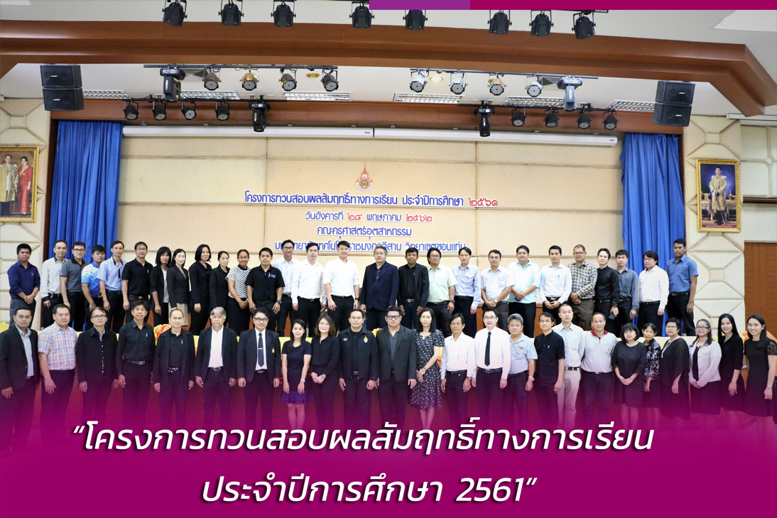 วันที่ 28 พฤษภาคม 2562 คณะครุศาสตร์อุตสาหกรรม มหาวิทยาลัยเทคโนโลยีราชมงคลอีสาน วิทยาเขตขอนแก่น จัดโครงการทวนสอบผลสัมฤทธิ์ทางการเรียน ประจำปีการศึกษา 2561 ณ ห้องประชุมแคแสดอาคาร วิทยบริการและเทคโนโลยีสารสนเทศ โดยมีอาจารย์ประพันธ์ ยาวระ คณบดีคณะครุศาสตร์อุตสาหกรรม เป็นประธานพิธีเปิดโครงการฯ กล่าวรายงานวัตถุประสงค์โครงการฯโดย ผู้ช่วยศาสตราจารย์ ดร.จารุวรรณ ธาระศัพท์ รองคณบดีฝ่ายวิชาการและวิจัย เพื่อทวนสอบผลสัมฤทธิ์ตามมาตรฐานผลการเรียนรู้ ระดับปริญญาตรี และให้การดำเนินงานด้านการประกันคุณภาพการศึกษาด้านการจัดการเรียนการสอนของแต่ละหลักสูตร จำนวน 12 หลักสูตร ให้เป็นไปตามมาตรฐาน และข้อกำหนด