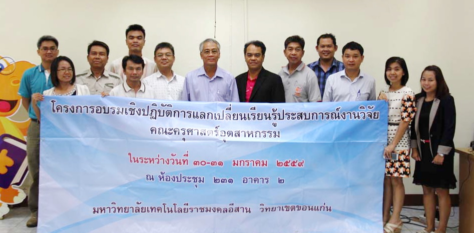 เมื่อวันที่ 30 – 31 มกราคม 2559 คณะครุศาสตร์อุตสาหกรรม จัดโครงการอบรมเชิงปฏิบัติการแลกเปลี่ยนเรียนรู้ประสบการณ์งานวิจัย ณ ห้องประชุมสำนักงานคณบดีคณะครุศาสตร์อุตสาหกรรม โดยมีวัตถุประสงค์เพื่อแลกเปลี่ยนเรียนรู้และแลกเปลี่ยนประสบการณ์ในการทำงานวิจัย โดยได้รับเกียรติจากรองศาสตราจารย์วรพจน์ ศรีวงษ์คล เป็นวิทยากรให้กับผู้เข้าร่วมอบรม จำนวน 52 คน มีการนำเสนองานวิจัยเพื่อแลกเปลี่ยนประสบการณ์ฯ จำนวน 14 โครงการ