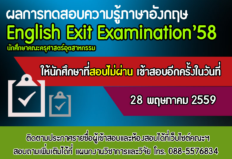 คณะครุศาสตร์อุตสาหกรรม ได้จัดการทดสอบภาษาอังกฤษสำหรับนักศึกษา (English Exit Examination) ครั้งที่ 1 ประจำปีการศึกษา 2558 ขึ้นเมื่อวันที่ 23 เมษายน 2559