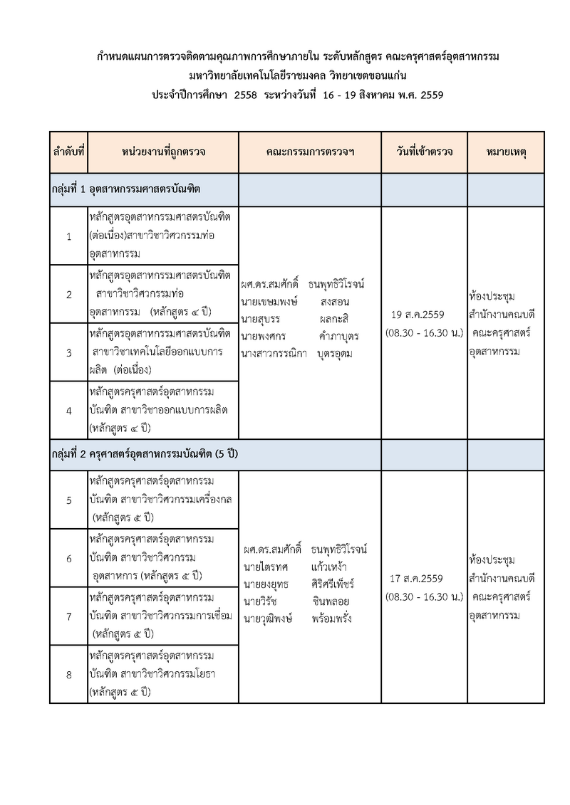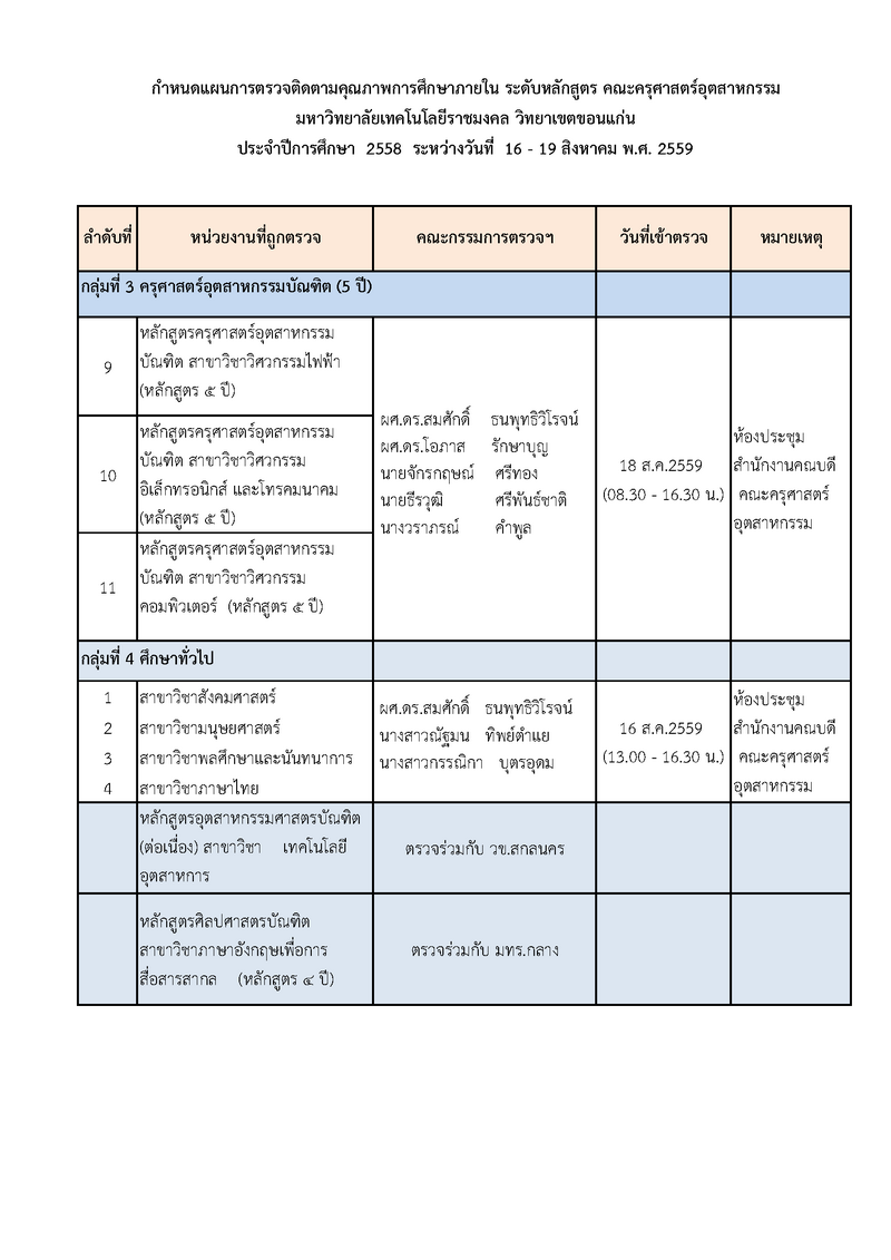 กำหนดการตรวจประเมินคุณภาพการศึกษาภายใน ระดับหลักสูตร ประจำปีการศึกษา 2558