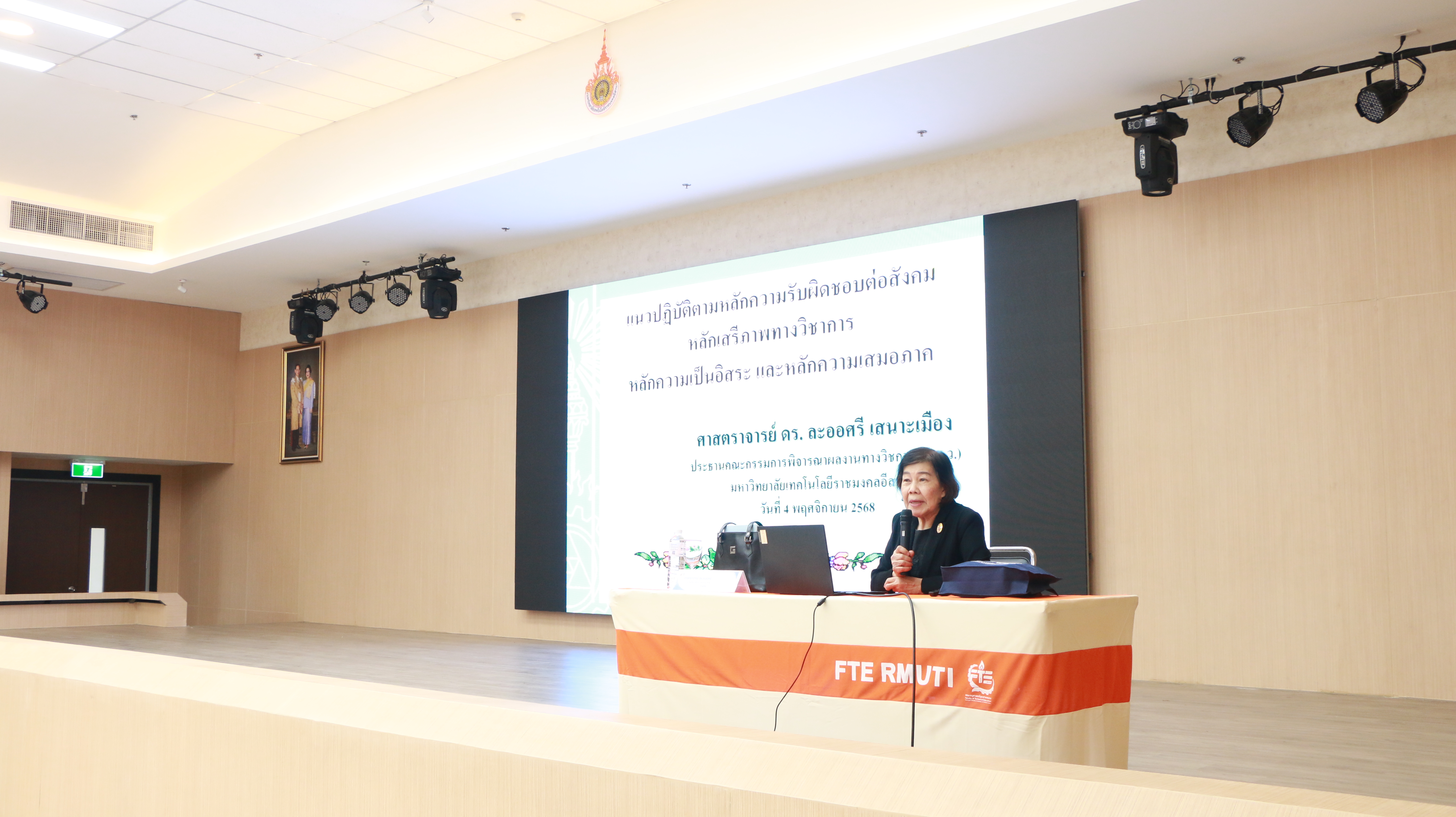 วันที่ 4 พฤศจิกายน 2568 คณะครุศาสตร์อุตสาหกรรม มหาวิทยาลัยเทคโนโลยีราชมงคลอีสาน วิทยาเขตขอนแก่น จัดโครงการพัฒนาศักยภาพบุคลากรเพื่อการเข้าสู่ตำแหน่งทางวิชาการ กิจกรรมที่ 2 อบรมเชิงปฏิบัติการ ในหัวข้อแนวปฏิบัติด้านความรับผิดชอบต่อสังคม จริยธรรมและจรรยาบรรณวิชาการ และการจัดทำเอกสารเพื่อขอกำหนดตำแหน่งทางวิชาการ ณ ห้องประชุมนราธิเบศร์ อาคารเฉลิมพระเกียรติ 72 พรรษา (อาคาร 19) โดยในวันนี้โครงการได้มุ่งเน้นที่การบรรยายเชิงลึกด้านจริยธรรมวิชาการและการฝึกปฏิบัติการจัดทำเอกสาร เพื่อส่งเสริมและเตรียมความพร้อมให้กับคณาจารย์ในการขอตำแหน่งทางวิชาการที่สูงขึ้น